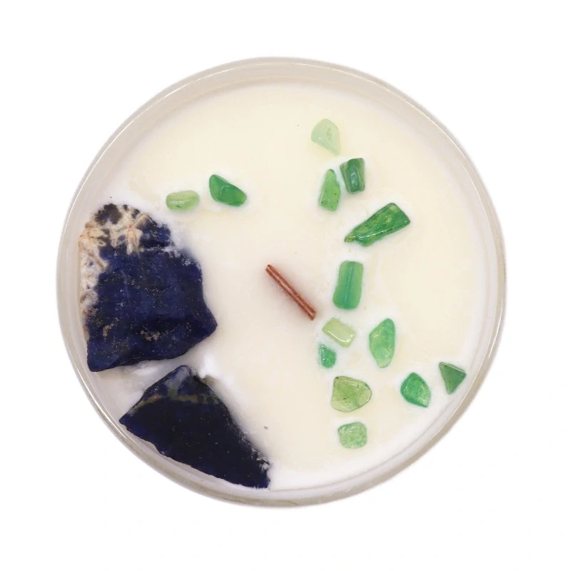 Čakrová sviečka s prírodnými kameňmi - Krčná čakra je vyrobená zo sójového vosku a obohatená o prírodné kamene.